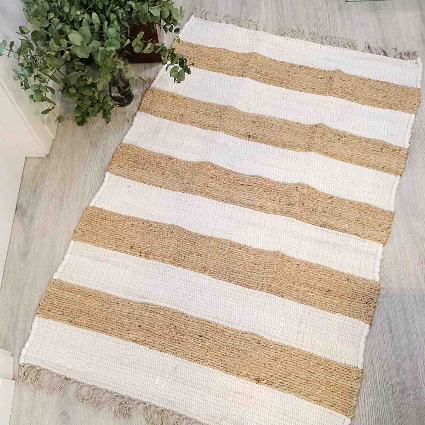 Alfombra rectangular de estilo actual y mediterráneo en yute natural con un toque sofisticado y elegante con un bonito diseño acabado en flecos en sus laterales.