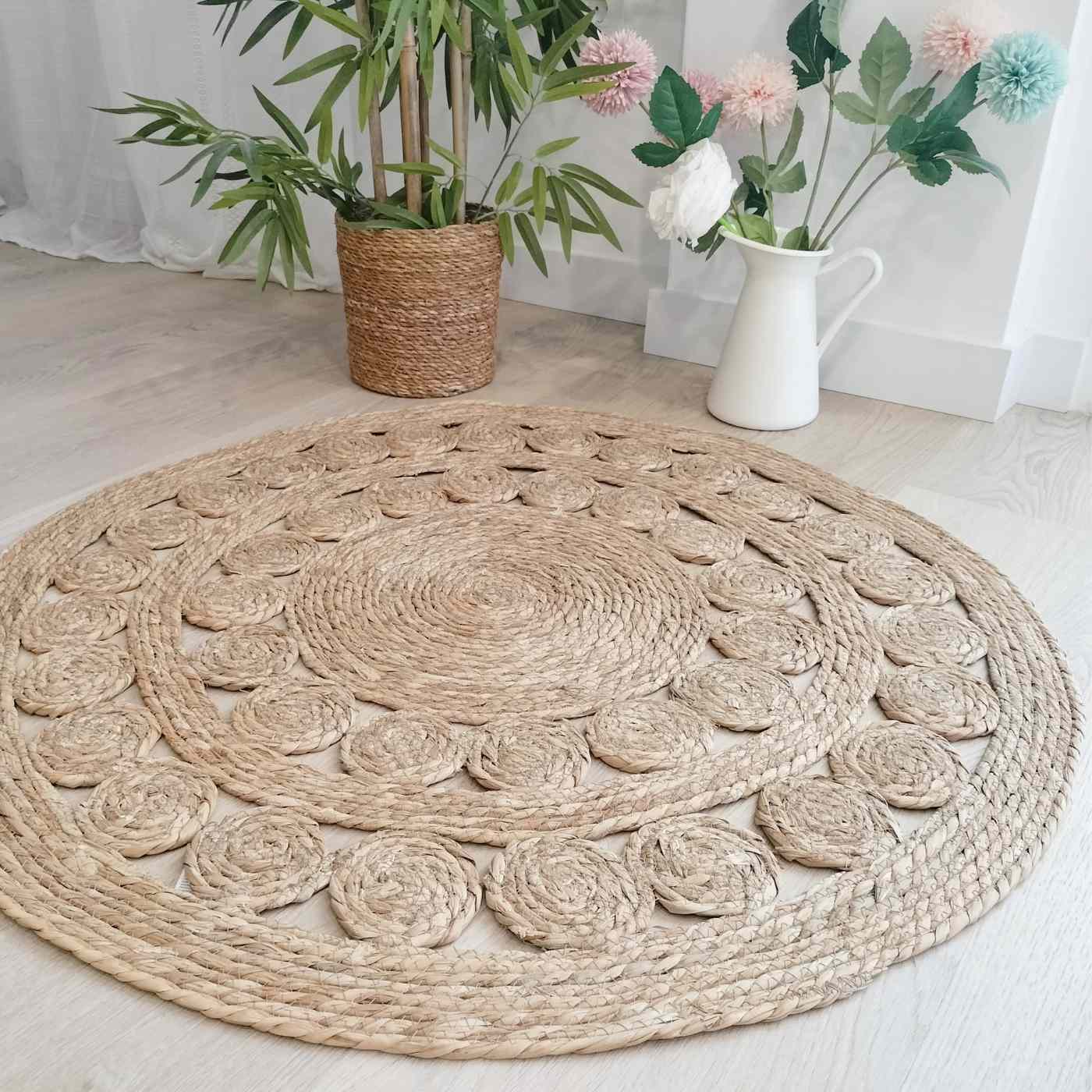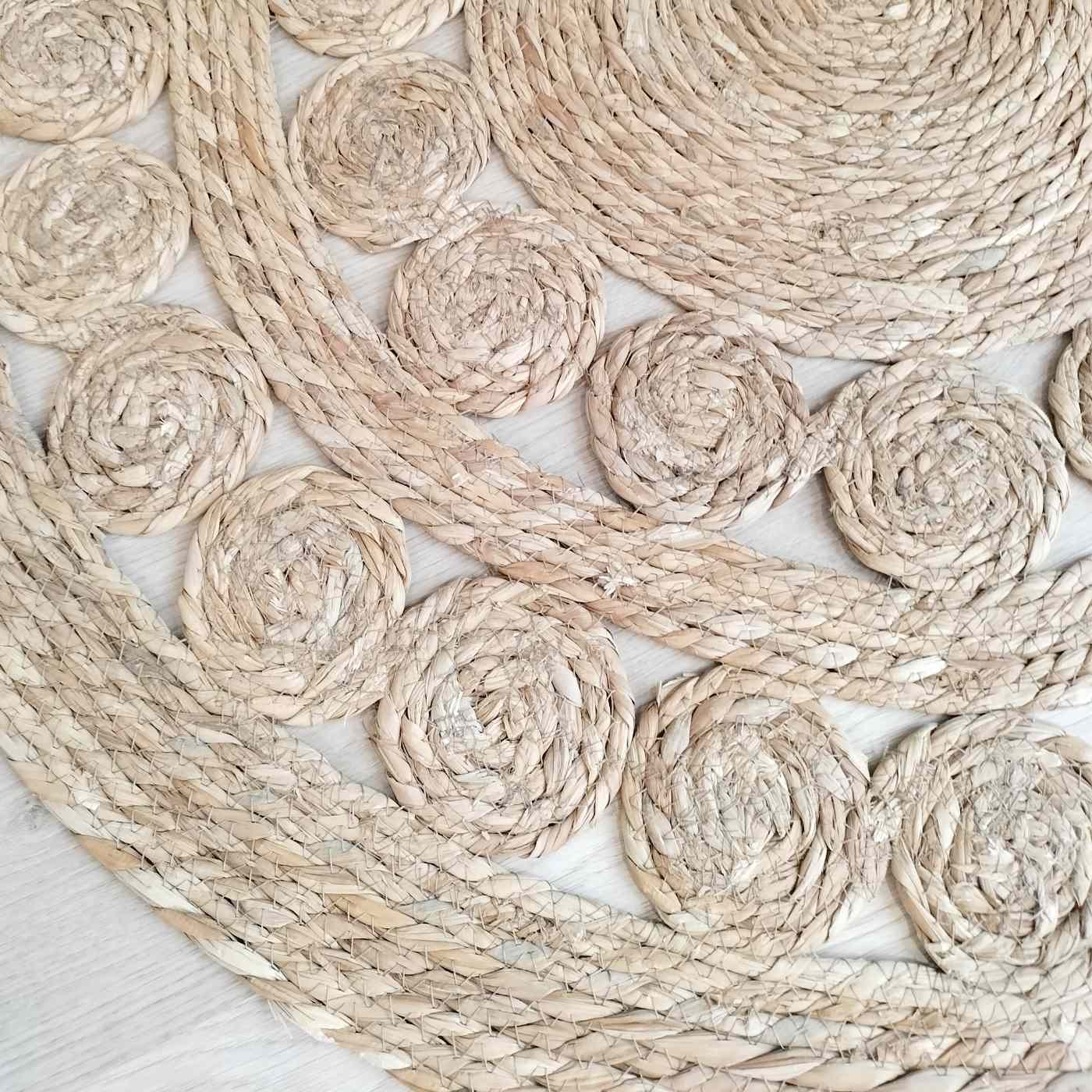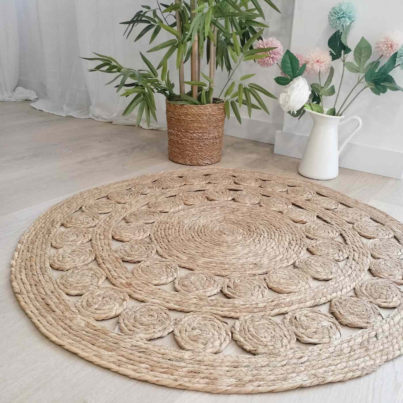 Alfombra redonda de fibra natural con formas circulares 100% tejida a mano, estilo boho.