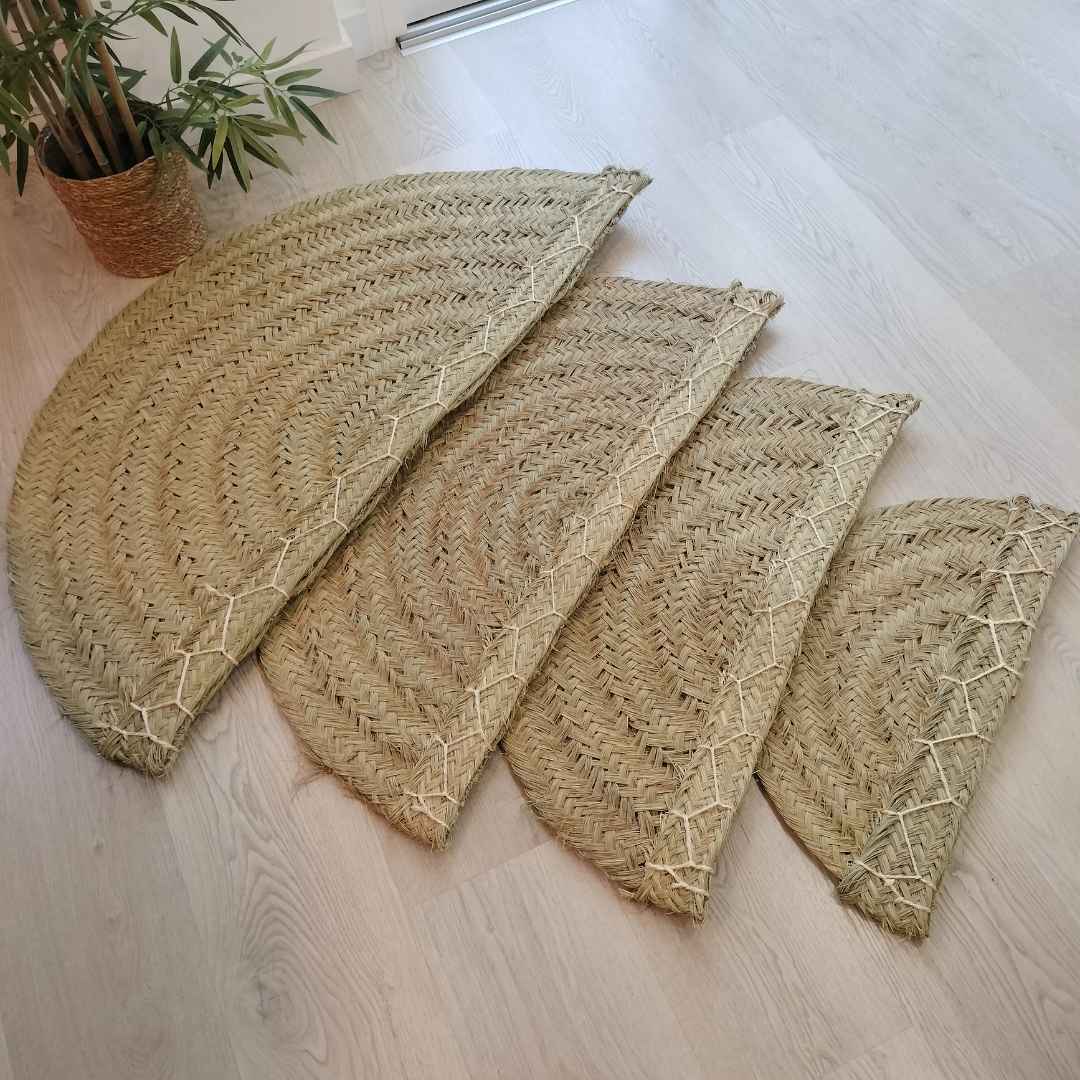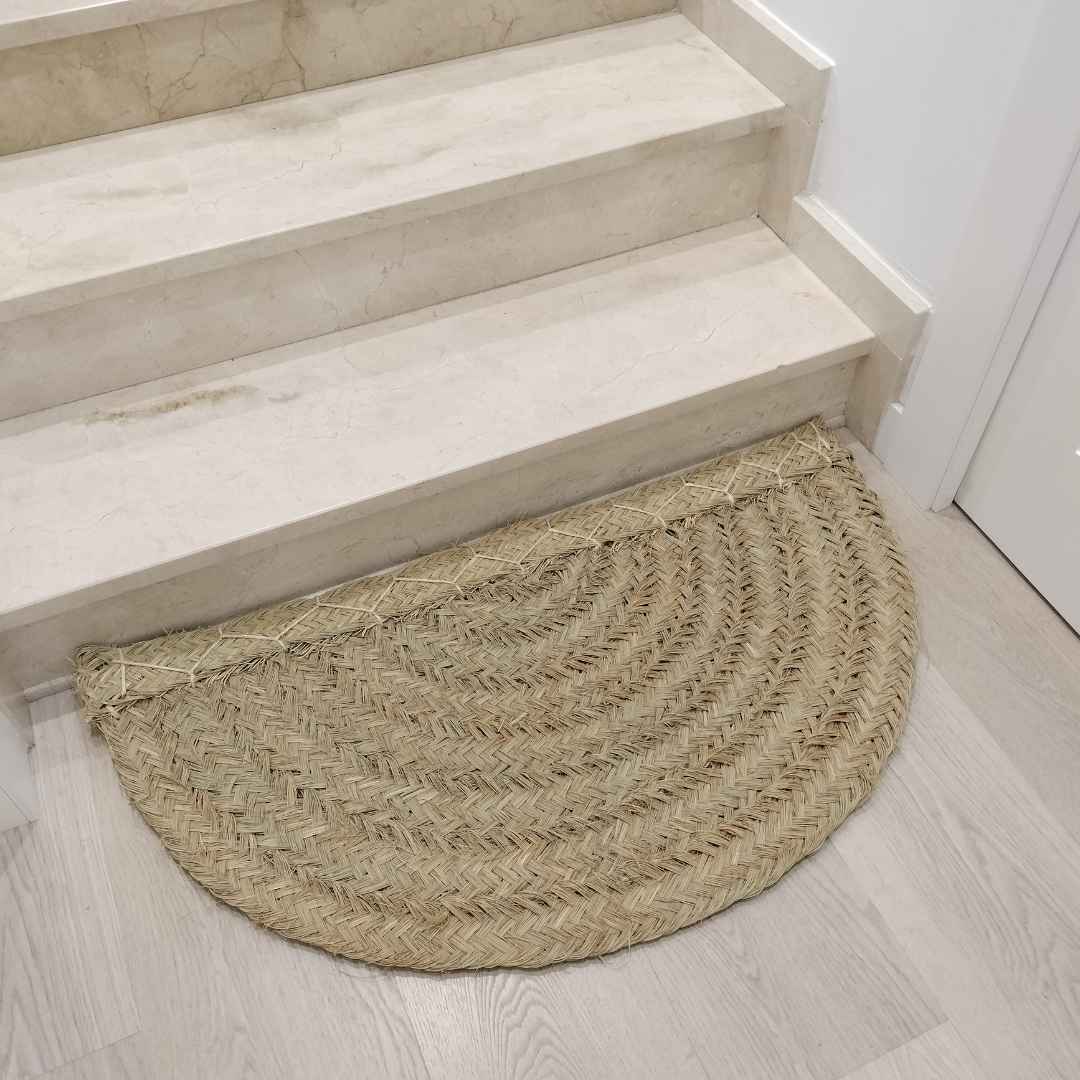 Alfombra de fibra de esparto natural en un elegante diseño de media luna. Perfecta para añadir un toque rústico y acogedor a cualquier espacio, ideal para entradas, dormitorios o rincones especiales de tu hogar.