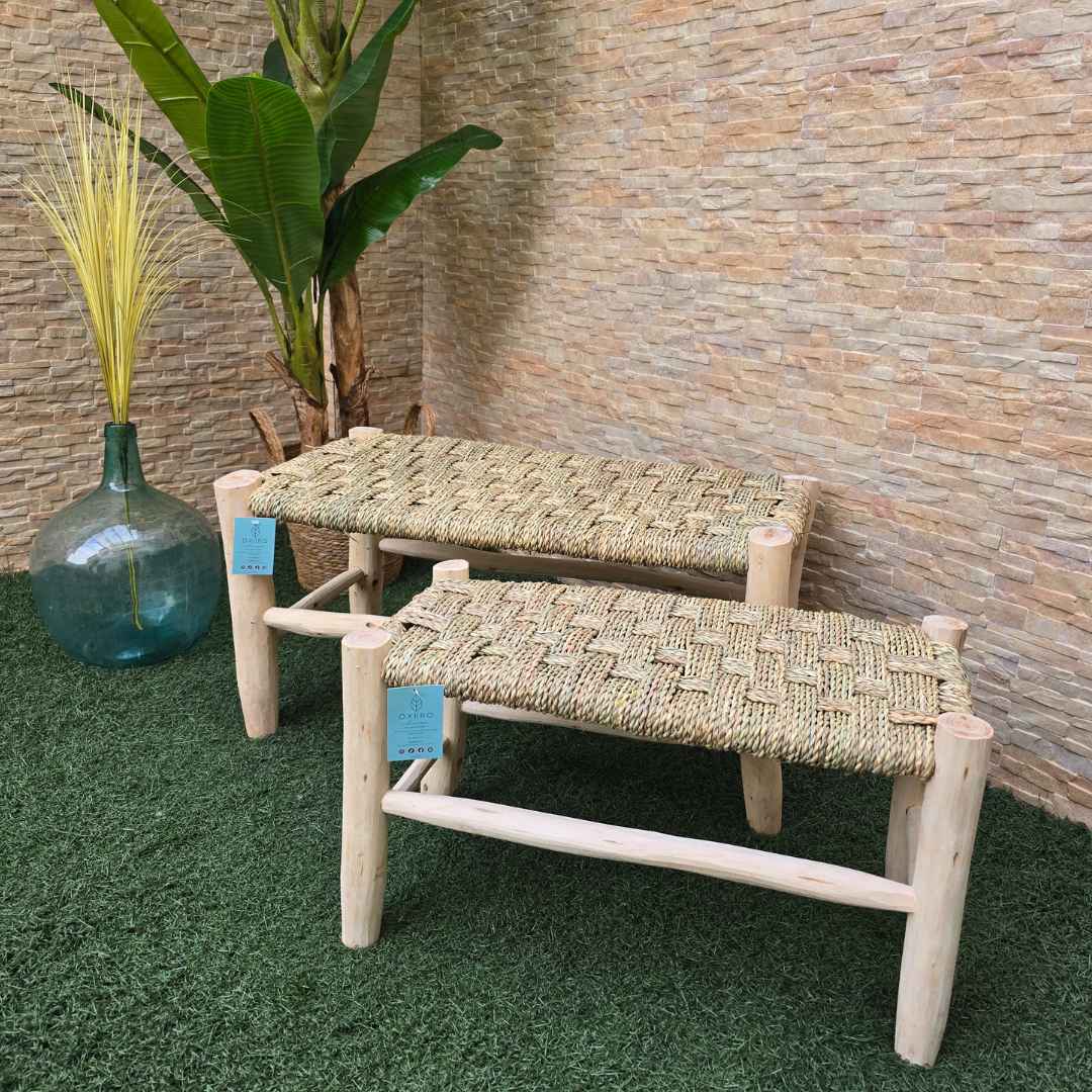 Este banco, hecho a mano con materiales naturales y sostenibles, es una pieza única que añadirá un toque de estilo boho a cualquier espacio. Su diseño elegante y funcional lo convierte en el complemento perfecto para tu hogar o jardín.