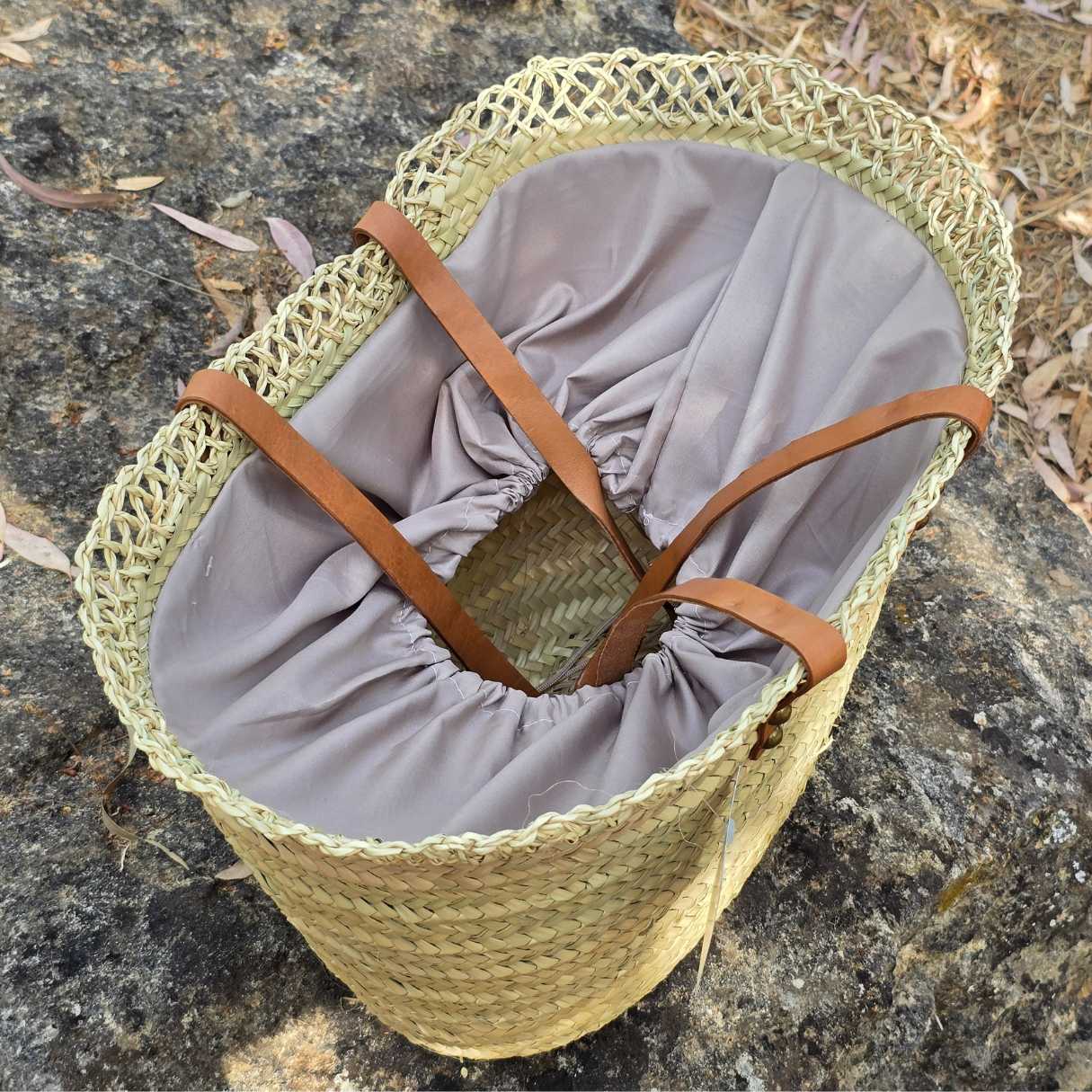 Bolso Capazo de playa elaborado en mimbre 100% natural con asas de piel, tejido artesanalmente en color natural con un elegante borde calado. Perfecto para llevar tus esenciales de verano, combinando un estilo boho y funcional.