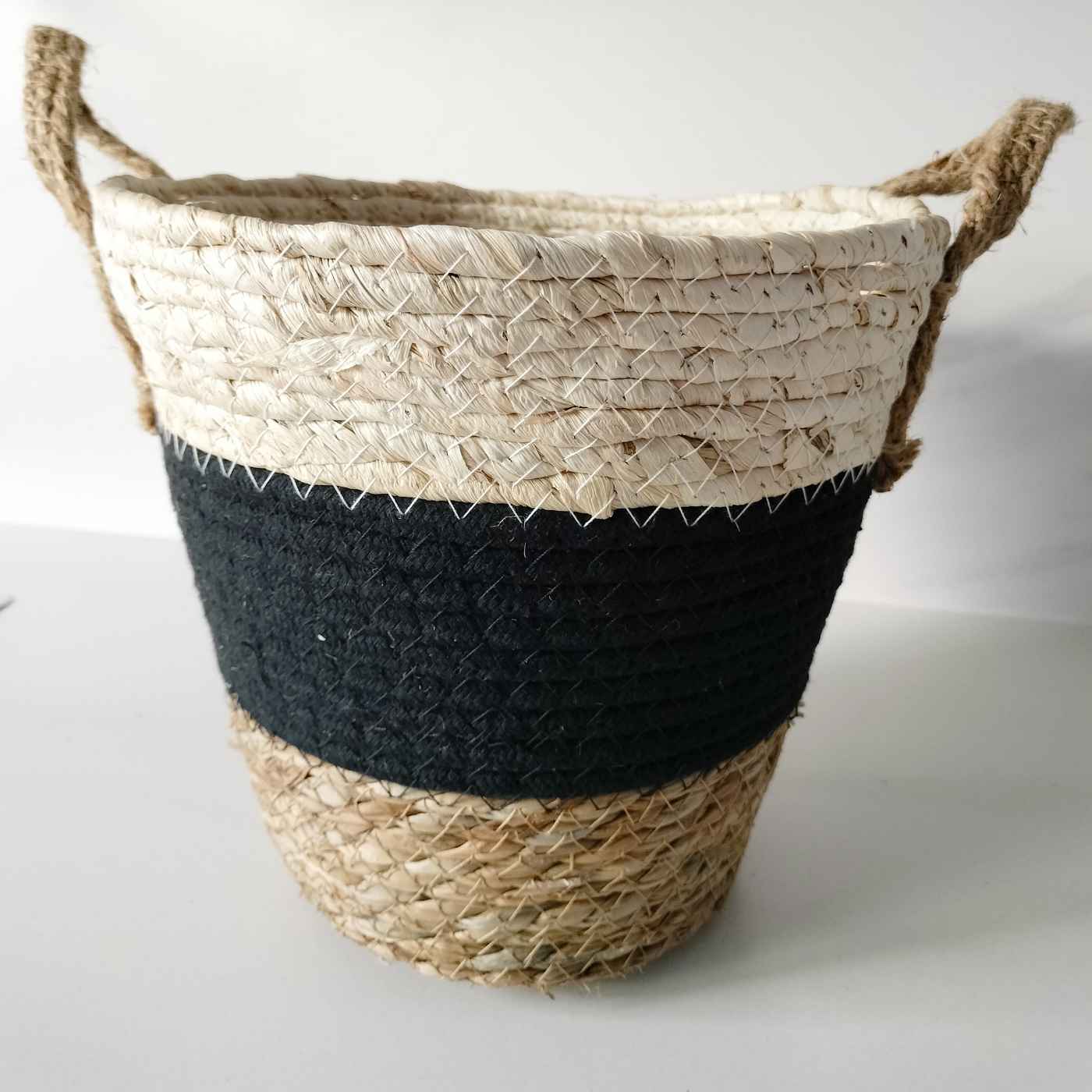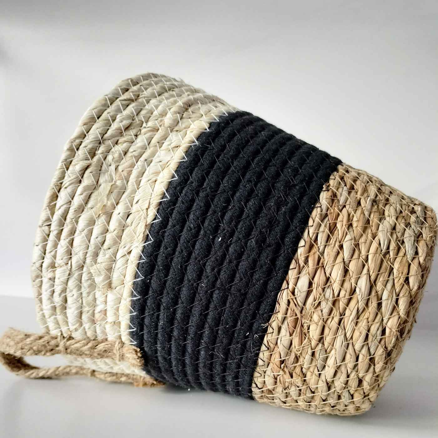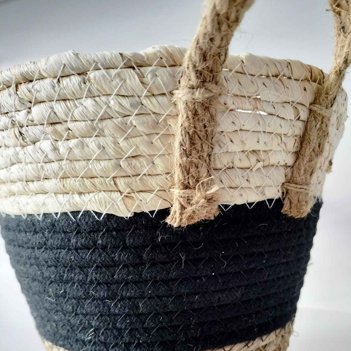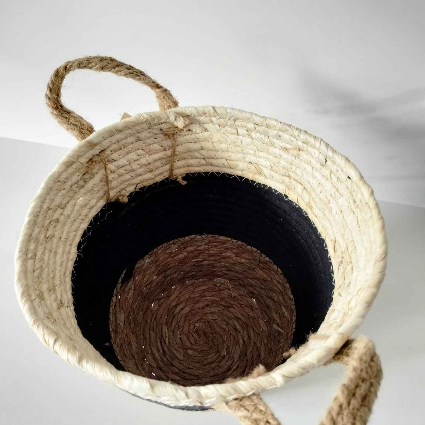 Cesta artesanal con un elegante diseño tricolor en tonos naturales y negro. Perfecta para organizar o decorar cualquier espacio, aportando un toque moderno y natural.