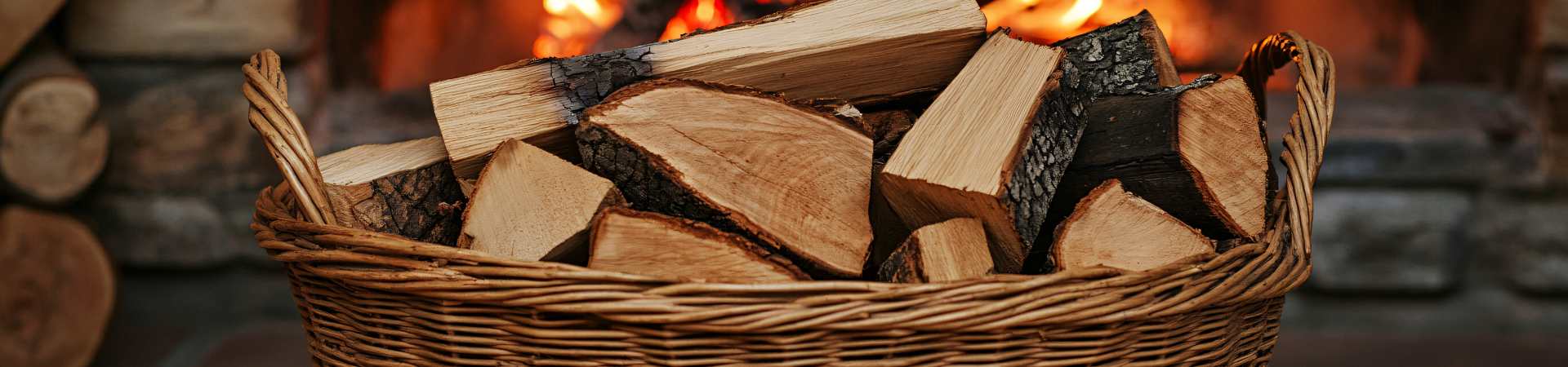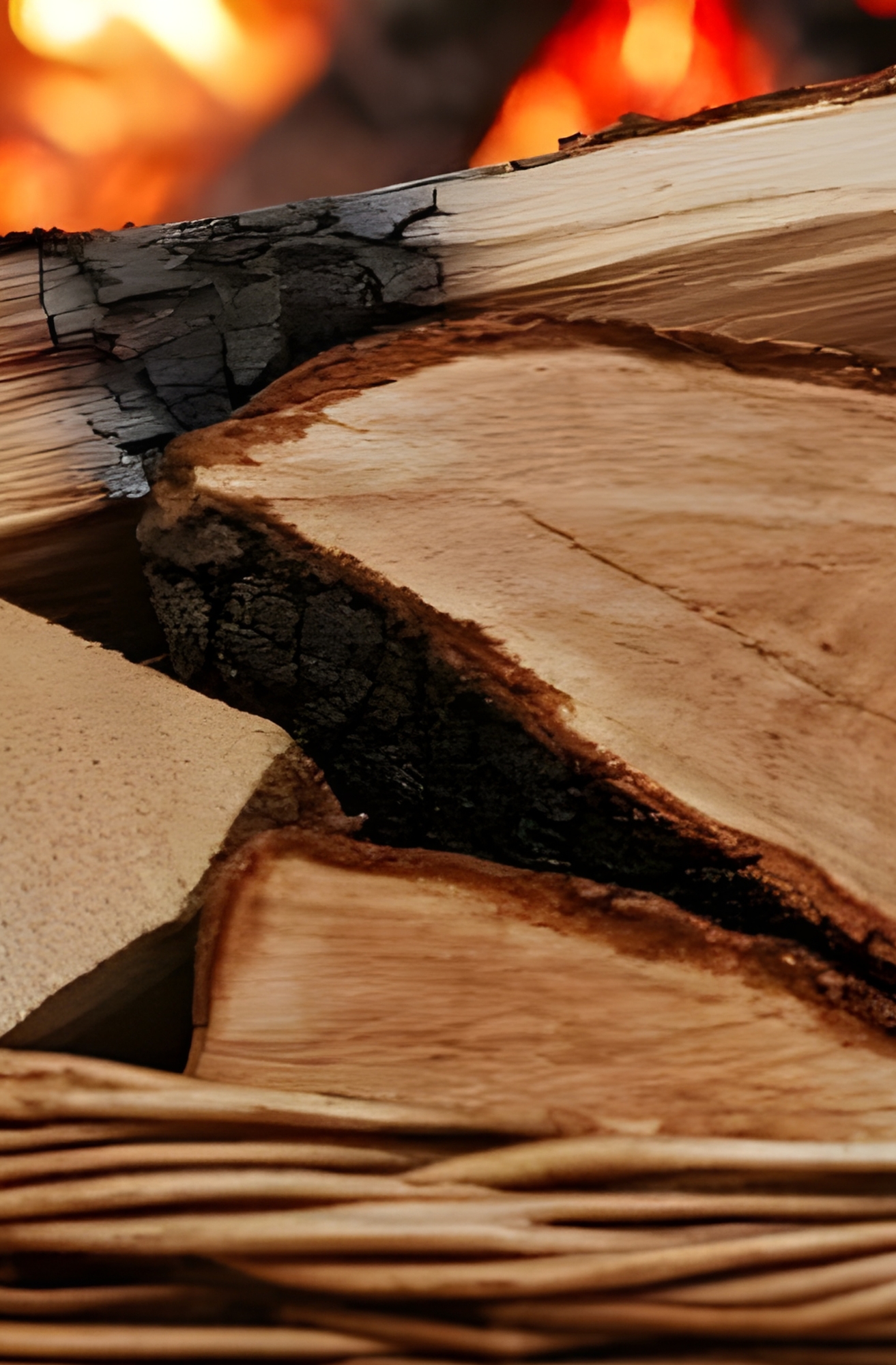 El mimbre ofrece un acabado más regular y elegante, ideal para salones donde la leña se integra como elemento decorativo.