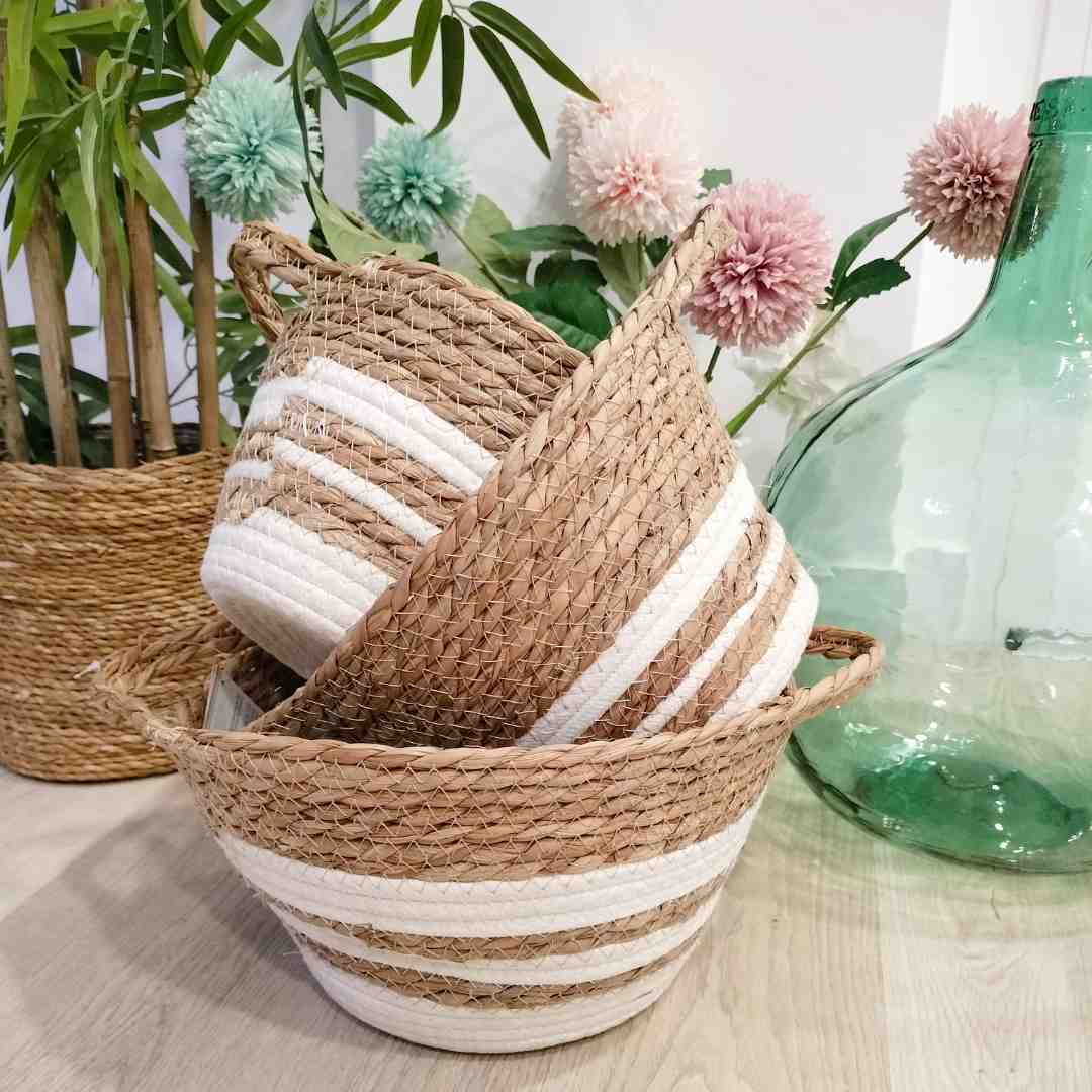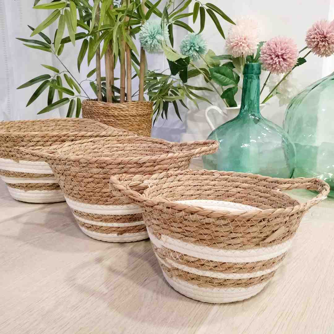 Set de 3 cestas de fibras naturales decoradas con líneas blancas, con un estilo nórdico moderno. Ideales para aportar un toque minimalista y funcional a cualquier espacio. Medidas: