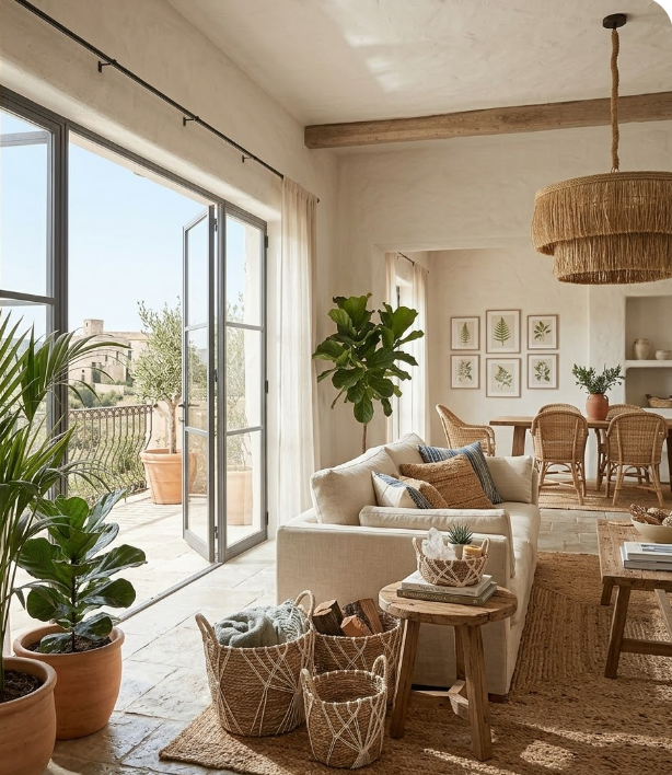 Pequeño detalle, gran impacto. Una cesta de rafia en el suelo del salón, con una manta enrollada o junto a la chimenea, añade esa capa final de naturalidad que completa el espacio.