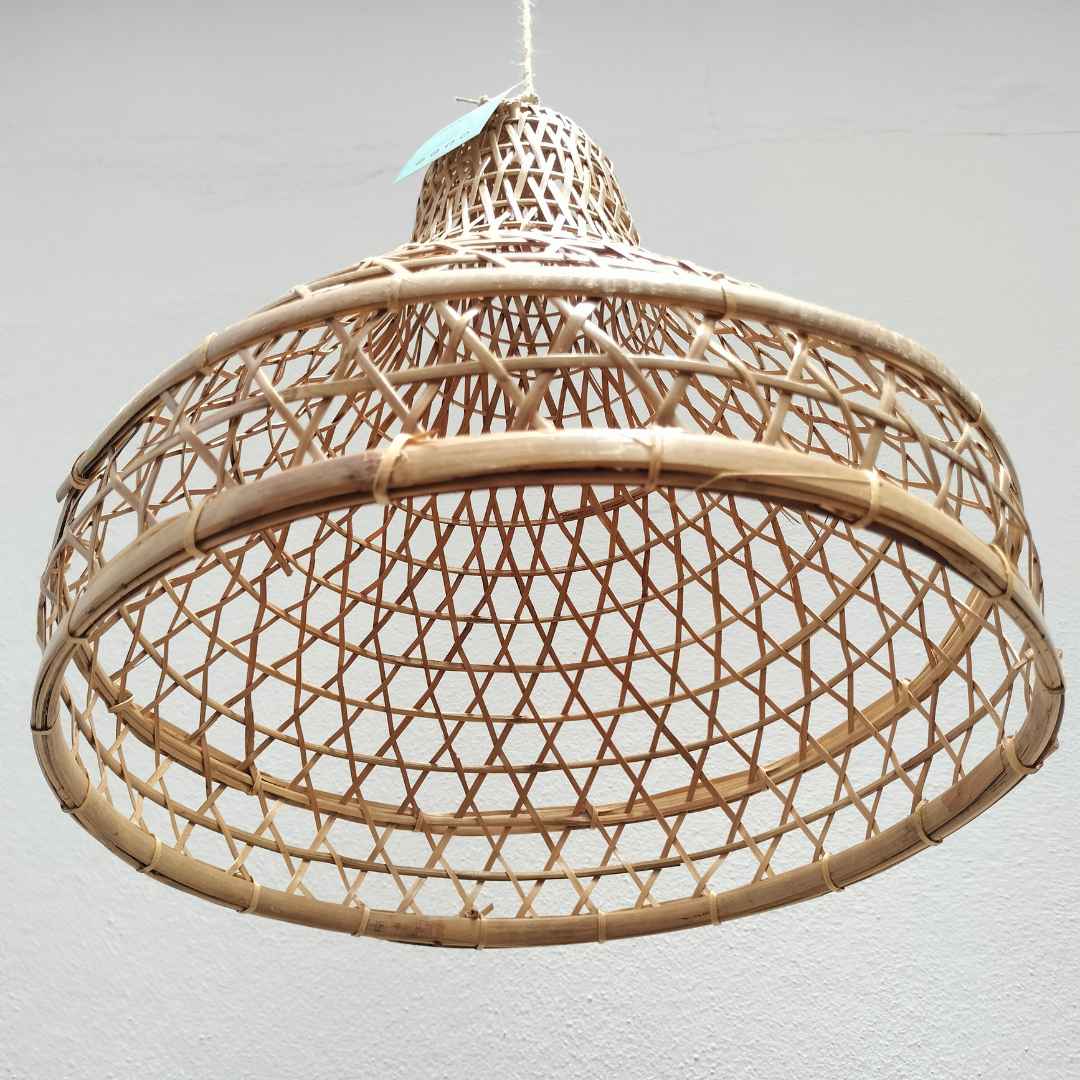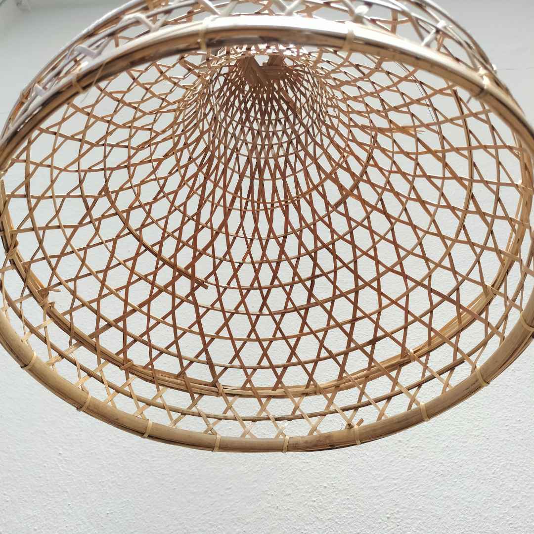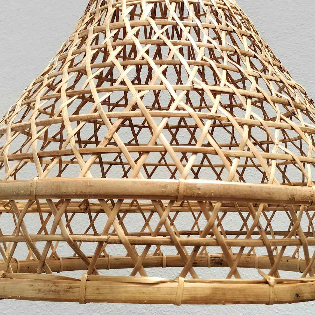 Lámpara balinesa de fibra natural ratán 100% elaborada de forma artesanal. Ideal para crear una iluminación cálida que añade encanto y textura a cualquier espacio.