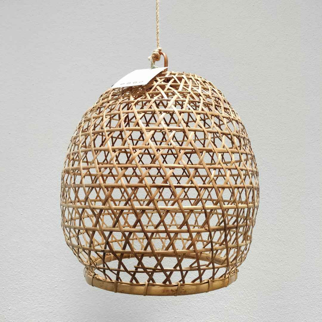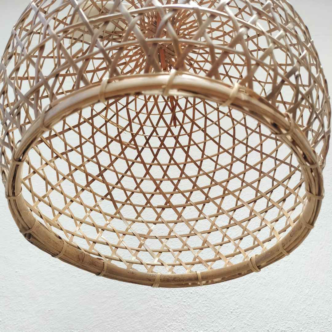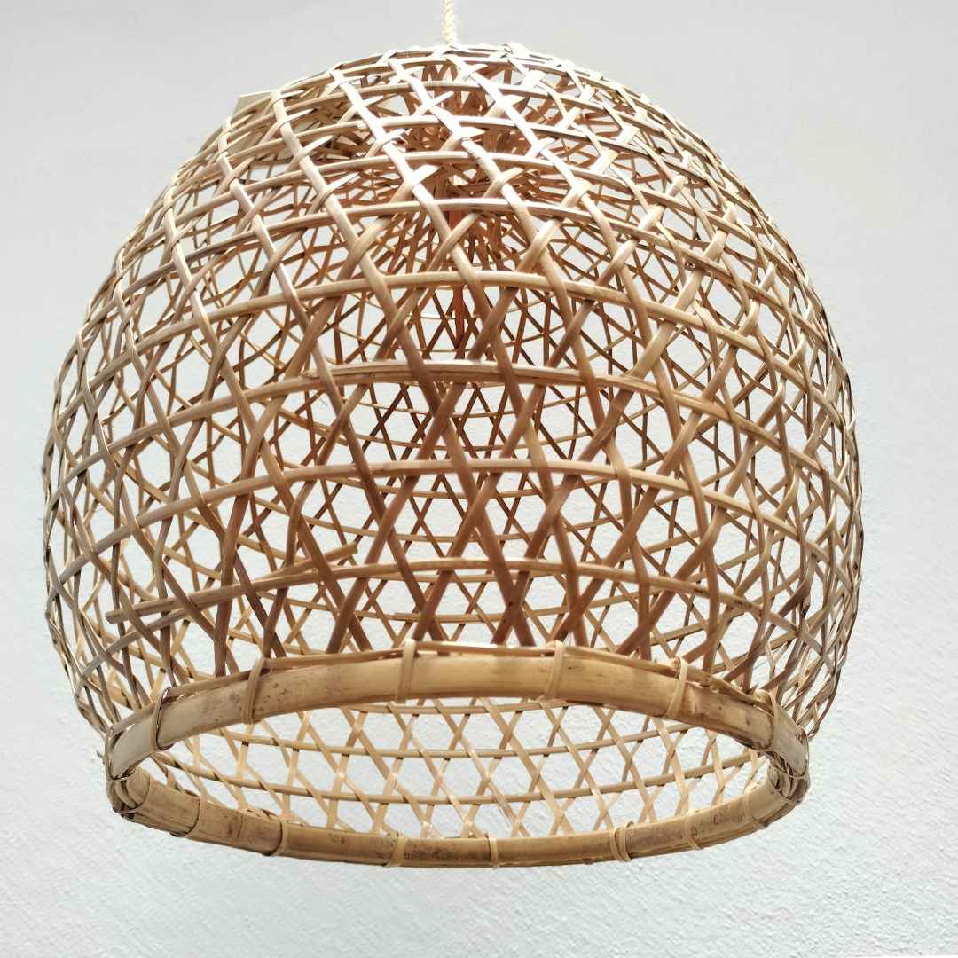 Lámpara balinesa de fibra natural ratán 100% elaborada de forma artesanal. Ideal para crear una iluminación cálida que añade encanto y textura a cualquier espacio.