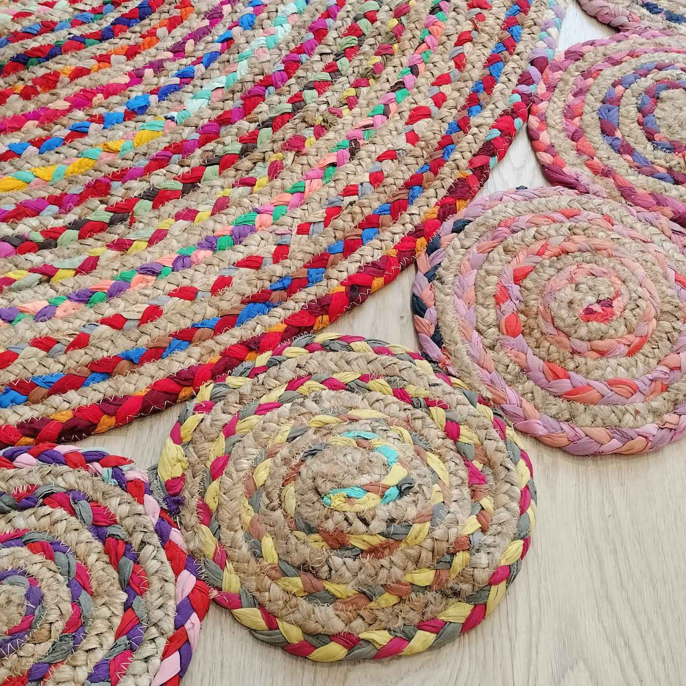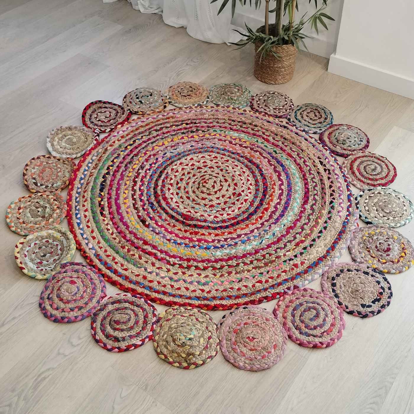 Alfombra redonda de yute natural hecha a mano. Su diseño trenzado y alegre llena el espacio de luz, armonía y calidez.