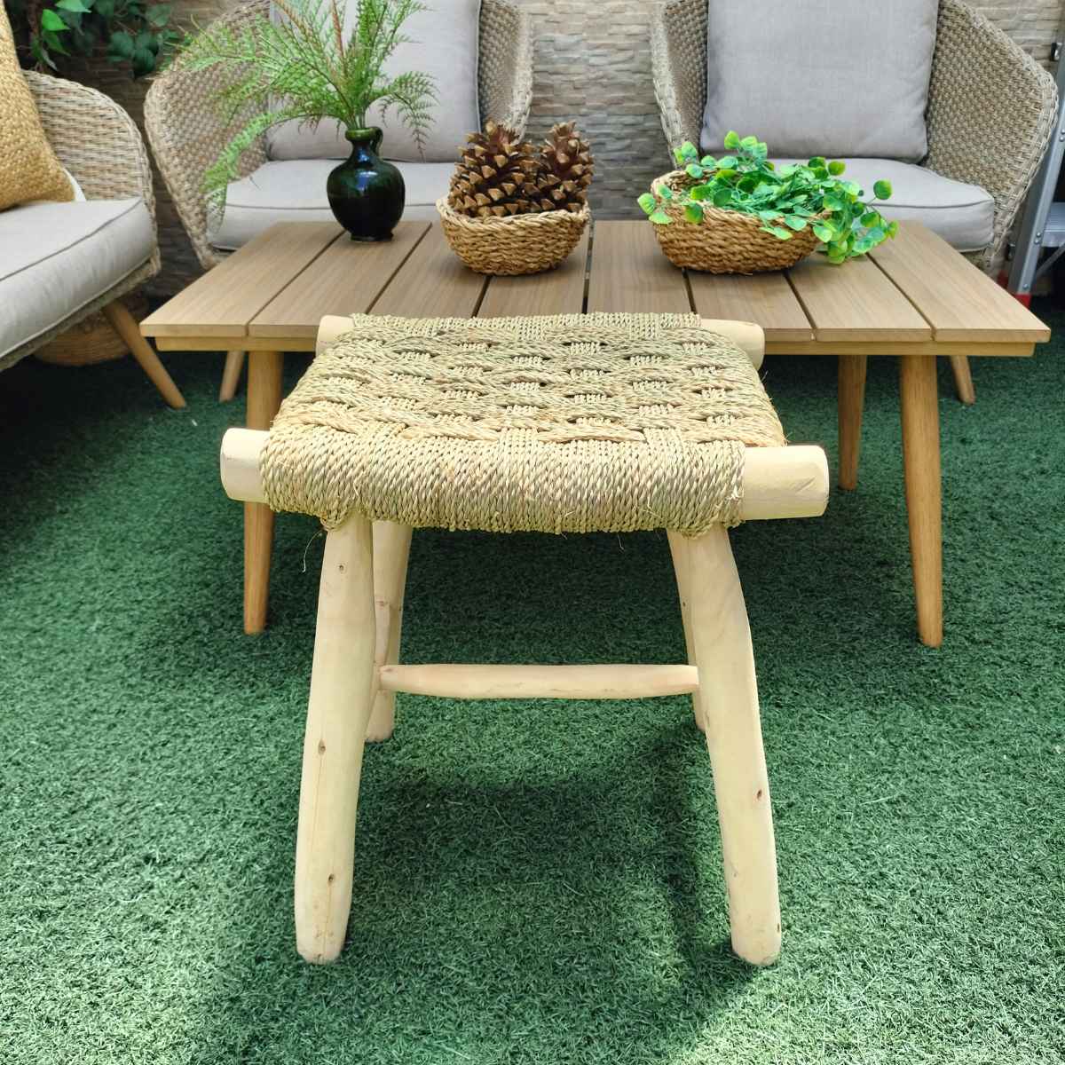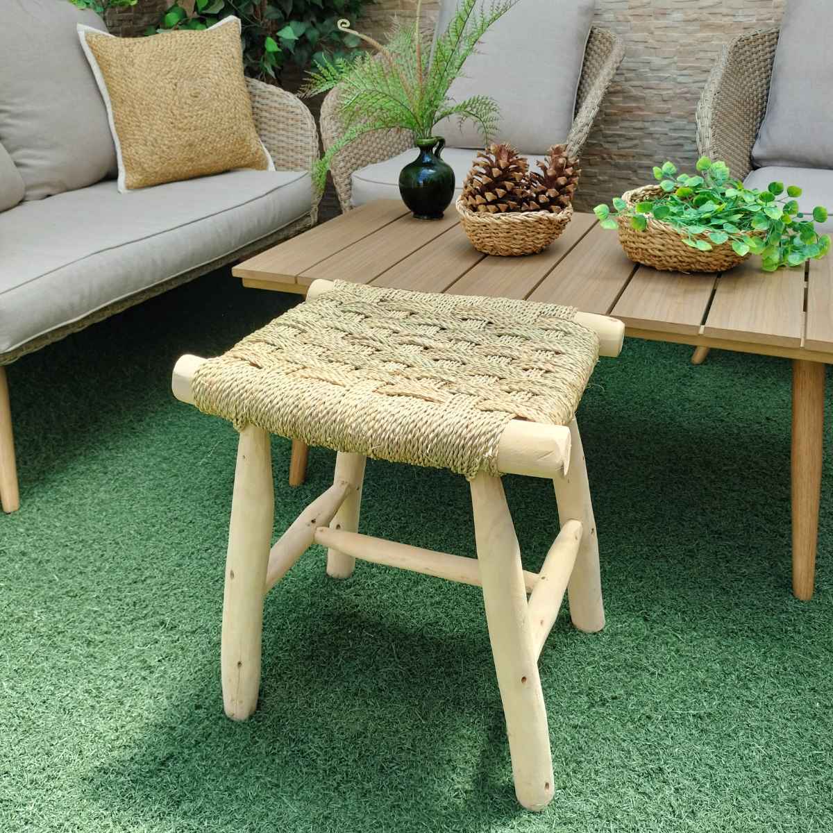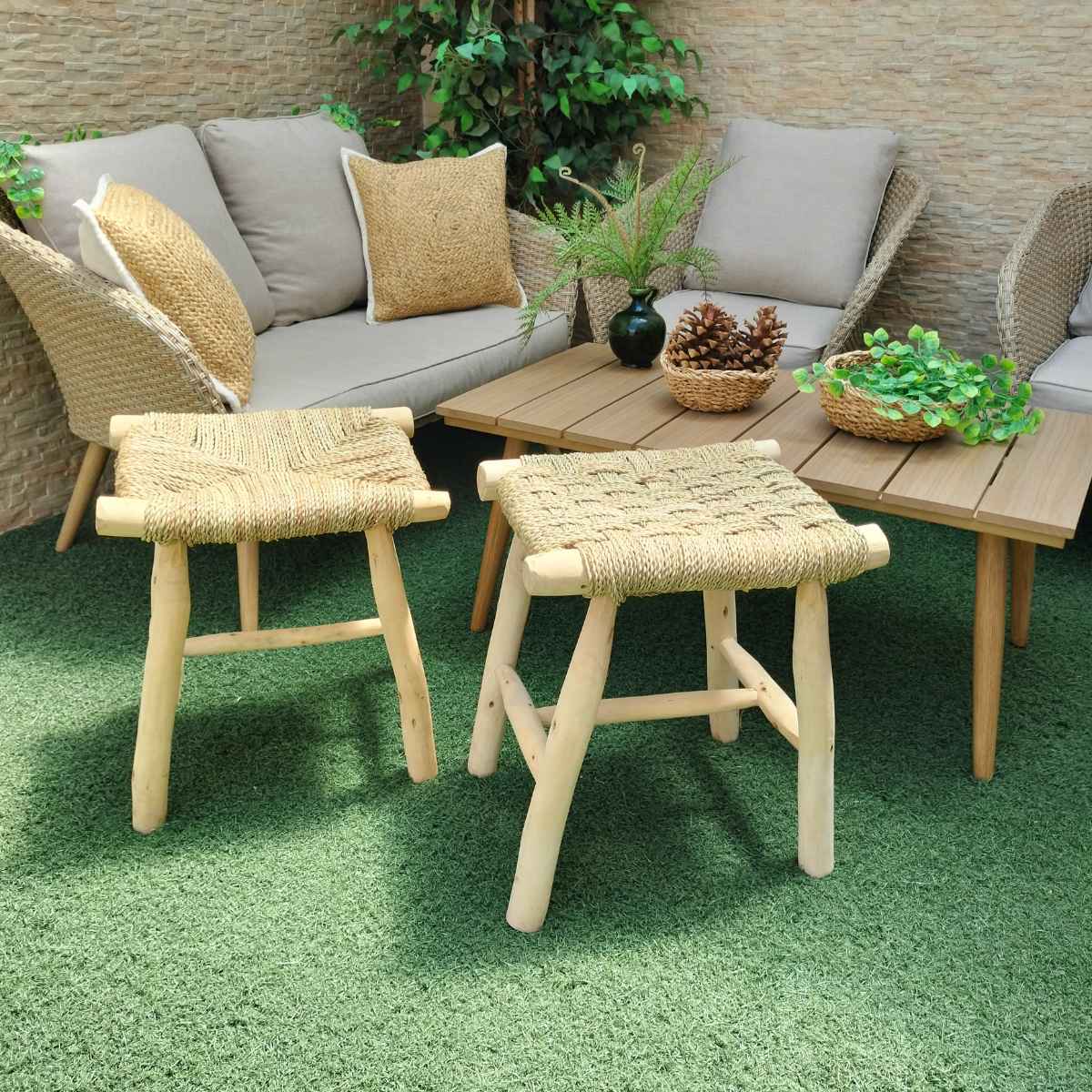 Un toque de naturaleza para tu hogar. Este taburete, elaborado a mano con madera de acacia y fibra vegetal de palmito, es una pieza única que combina estilo y funcionalidad. Su diseño boho aporta calidez y originalidad a cualquier espacio.