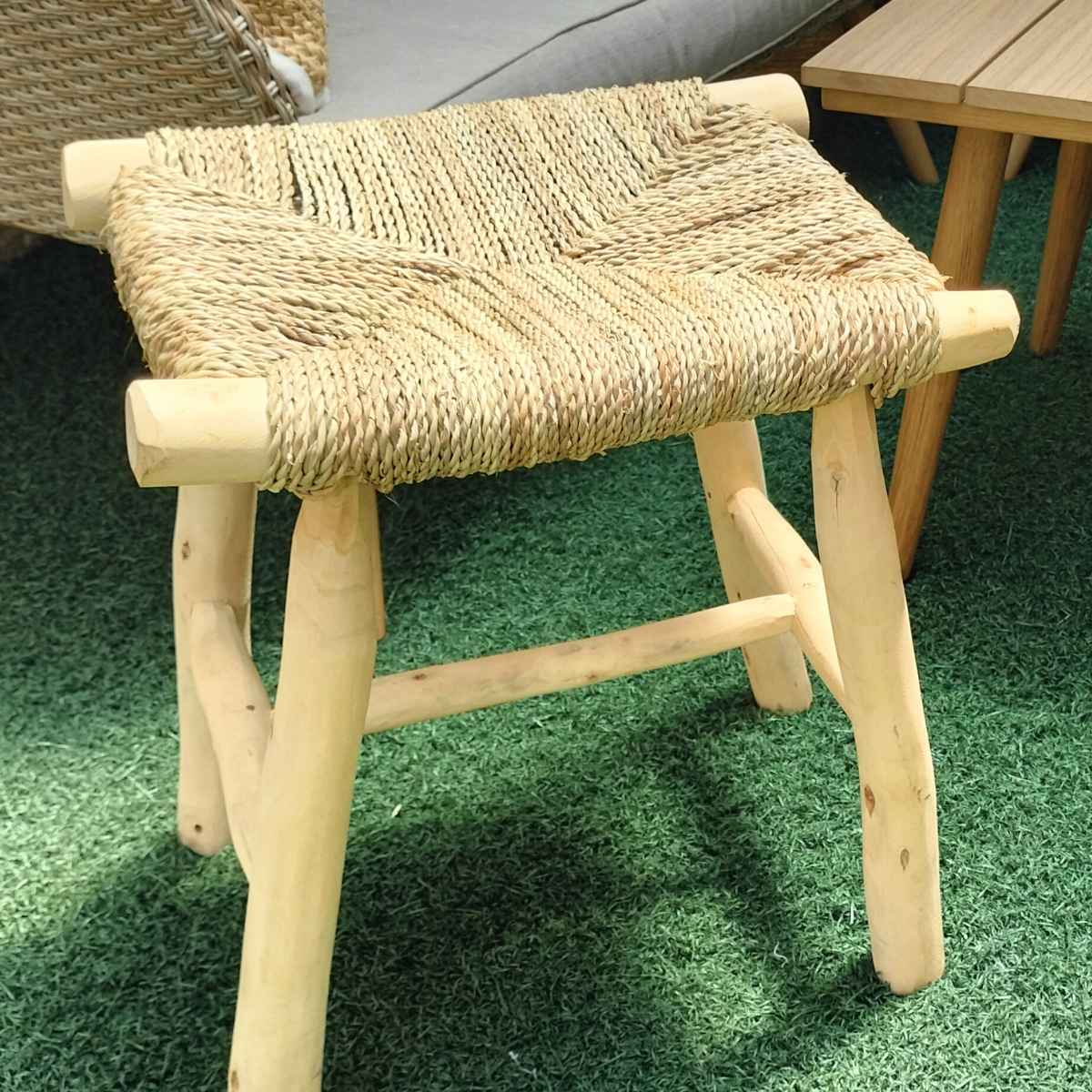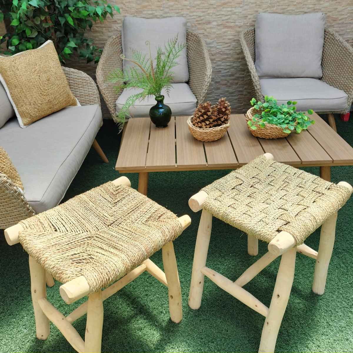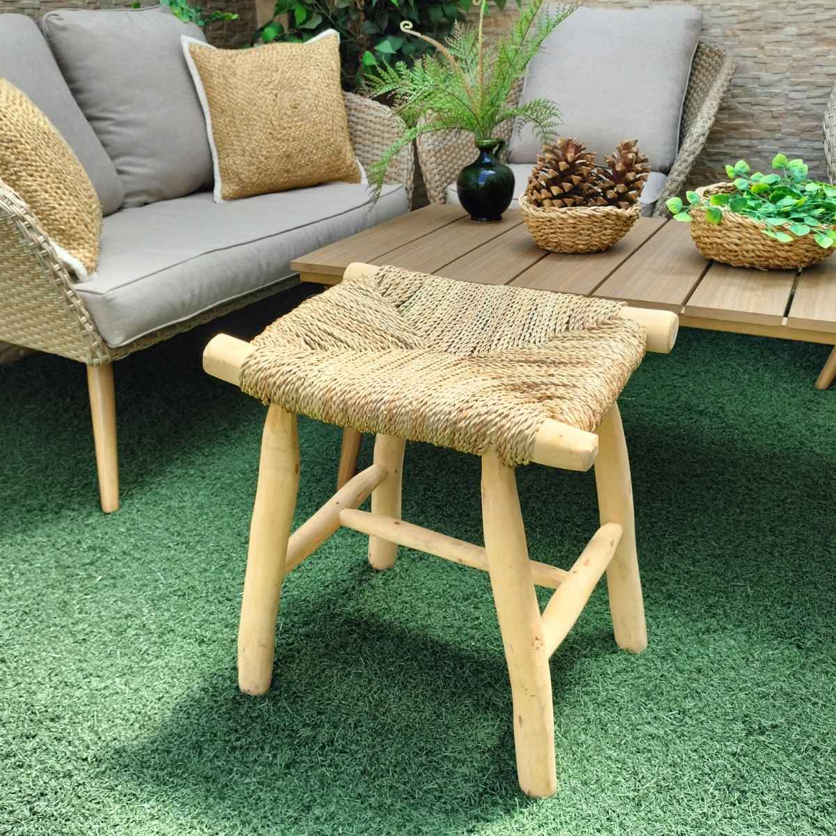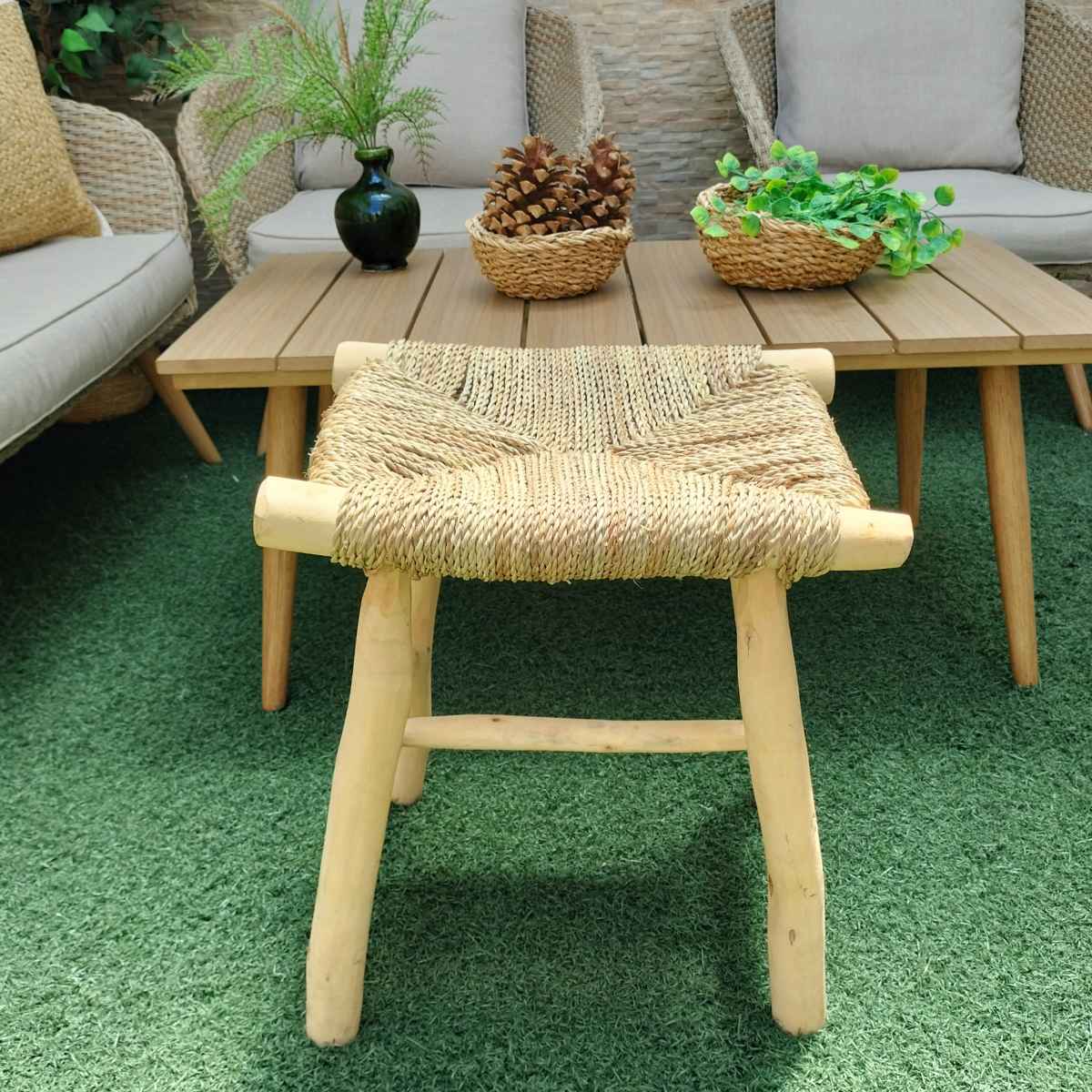 Un toque de naturaleza para tu hogar. Este taburete, elaborado a mano con madera de acacia y fibra vegetal de palmito, es una pieza única que combina estilo y funcionalidad. Su diseño boho aporta calidez y originalidad a cualquier espacio.